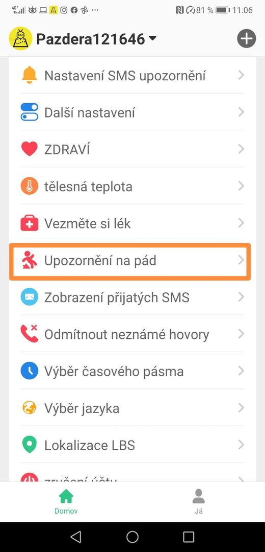 Velmi užitečná funkce pro seniory. Naše zařízení pro dospělé umí upozornit na pád a citlivost detekce pádu je možné nastavit od 1 do 6. Při pádu může zařízení poslat oznámení do telefonu nebo přímo volat. Nastavení je na vás.