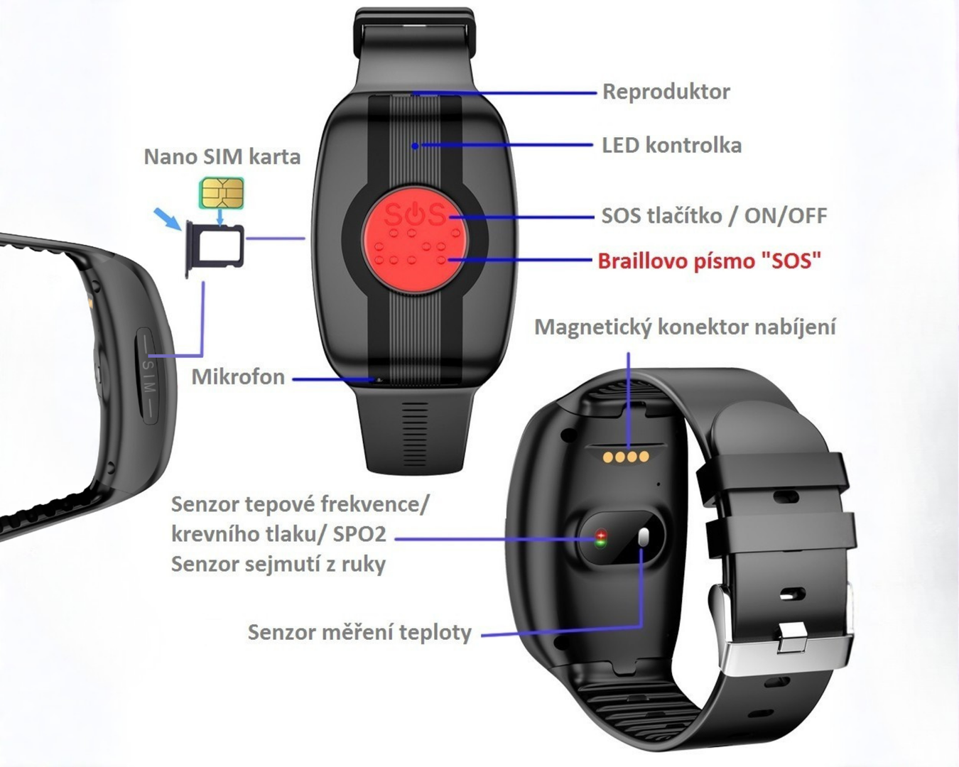 - SOS volání a upozornění na pád