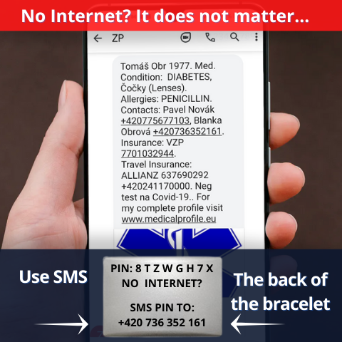 By sending the PIN in SMS to the number +420 736 352 161 (laser marked on the bracelet), a summary of the main data from your medical profile will come to the rescuer's phone.