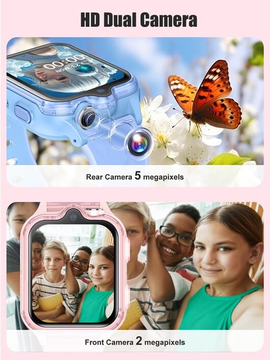 FOR CHILDREN. The newest kids’ smartwatches full of fun, safety, and communication – now with a dual camera! Thanks to the front and top cameras, children can easily take photos, record videos, and enjoy higher-quality video calls, while parents get a better overview of their child’s surroundings. Support for 4G networks, real-time GPS tracking, and apps directly in the watch make it the perfect companion for little adventurers and peace of mind for parents – you always know where your child is. SOS button, safe zones, and school mode are included as standard. Animated watch faces, popular apps like WhatsApp, YouTube, or TikTok, music and videos – all directly on the watch. The menu and apps are fully in English, designed to be easy to use for children. Click on the image for more information.