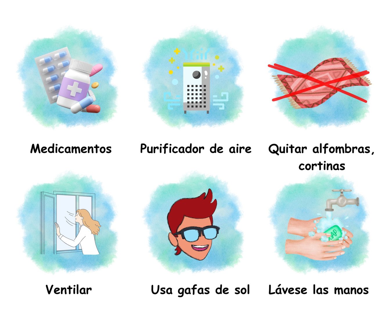 4) Usar gafas de sol o anteojos recetados que protejan los ojos del polen ayudará con las alergias al polen. También es importante observar una mayor higiene, por ejemplo, lavarse frecuentemente las manos y el cabello, donde el polen puede depositarse fácilmente. En casa, conviene cambiarse de ropa con más frecuencia para evitar que el polen entre al interior.