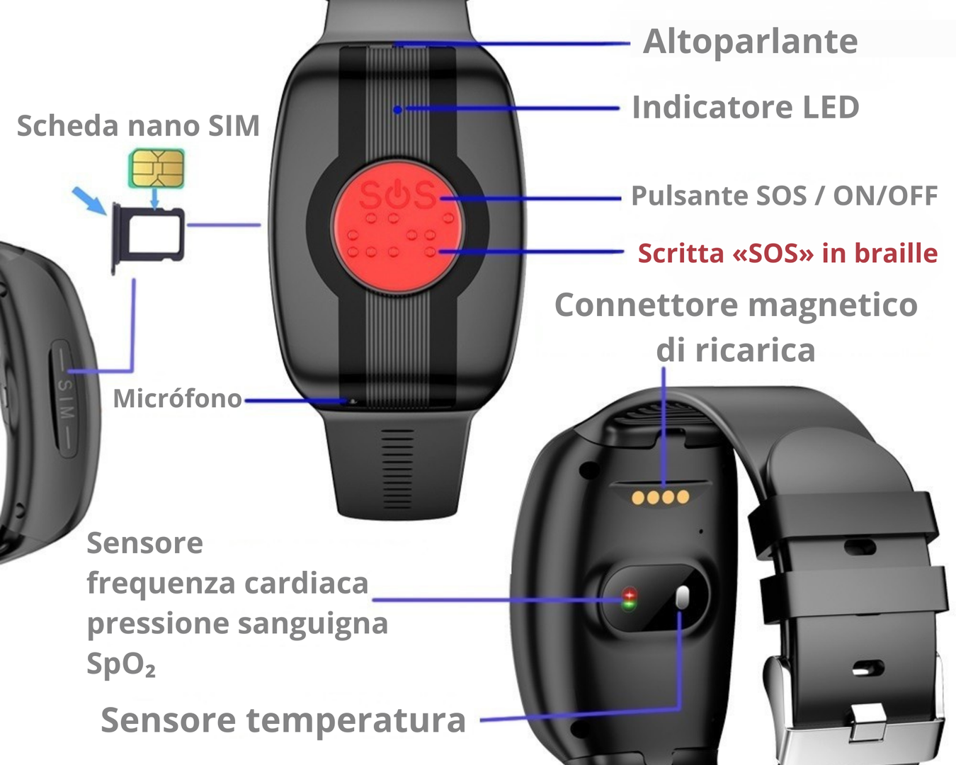 Alcuni braccialetti SOS moderni possono misurare in modo indicativo la temperatura corporea o altri parametri (ad es. frequenza cardiaca, pressione, SpO₂). Precisiamo che non si tratta di un dispositivo medico: i valori sono solo indicativi e vengono misurati esclusivamente al polso.