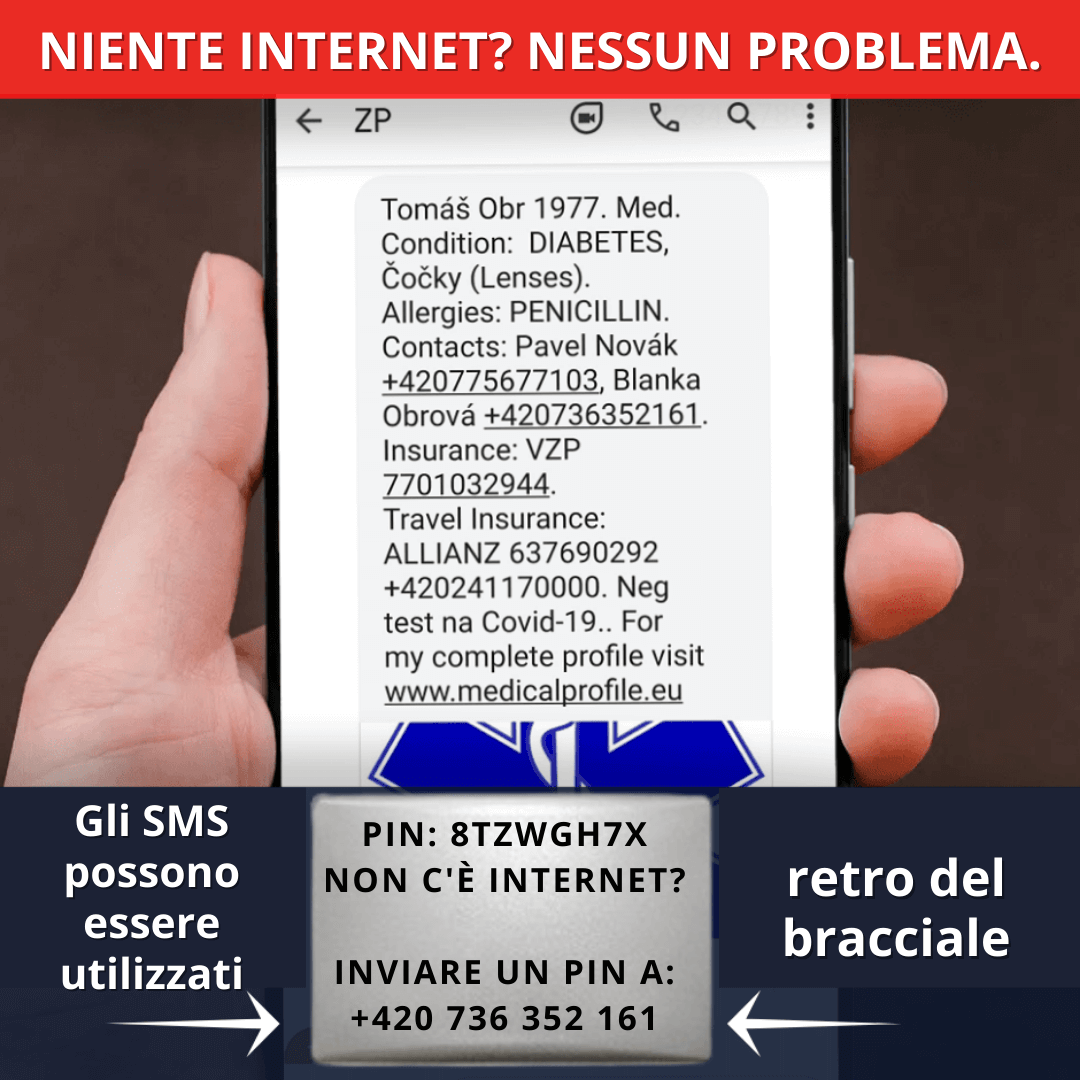 Inviando il PIN in un SMS al numero +420 736 352 161 (indicato sul braccialetto), verrà inviato al telefono del soccorritore un riepilogo dei dati principali del profilo sanitario.
